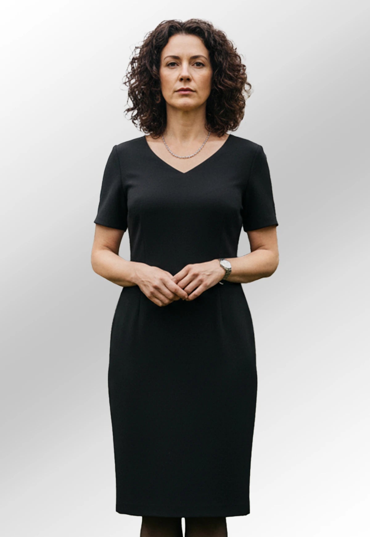 While specifically designed for funeral and memorial attire, the Brook Taverner V-Neck Funeral Dress is also a versatile addition to any professional wardrobe. Its classic black colour and refined design make it suitable for corporate wear, hospitality uniforms, and formal events. Pair it with a tailored blazer or an elegant overcoat for a fully polished look.