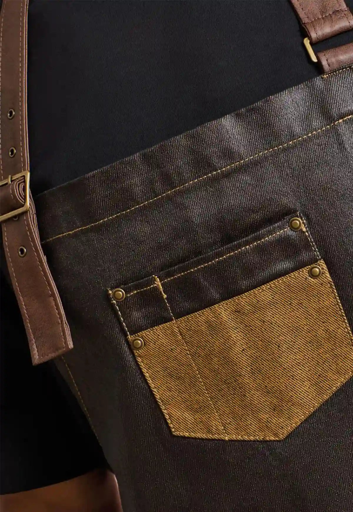 This Waxed Look Denim Bib Apron has rustic charm for those who want a more vintage approach to their service uniforms. Decorated with contrast fabric features for design and functionality. The faux leather detail really elevates this service apron to give it an authentic, luxurious appearance, popular with many establishments.