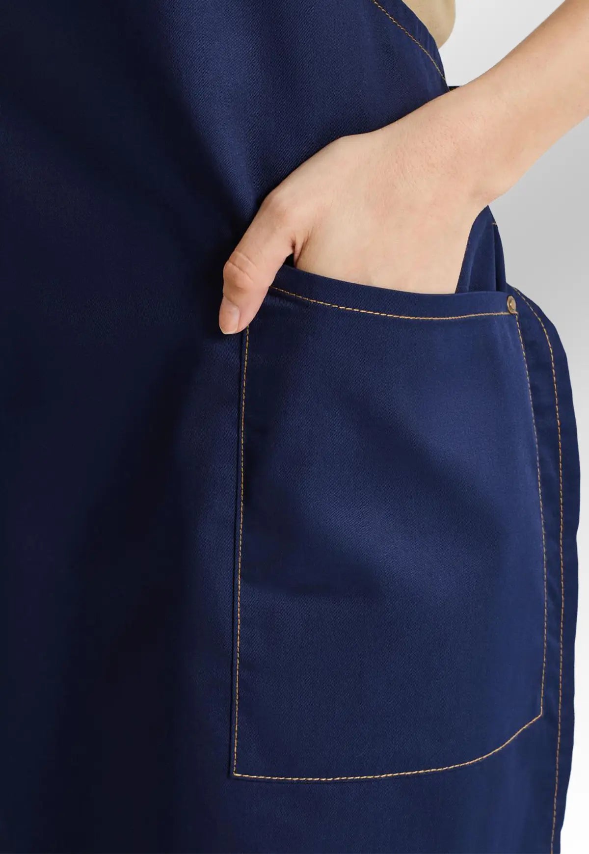 The eco-friendly ‘Barley’ Contrast Stitch Bib Apron PR121, perfect for hospitality teams across the UK, made with a combination of recycled polyester and sustainable cotton. Featuring two handy side pockets with rivet detail.